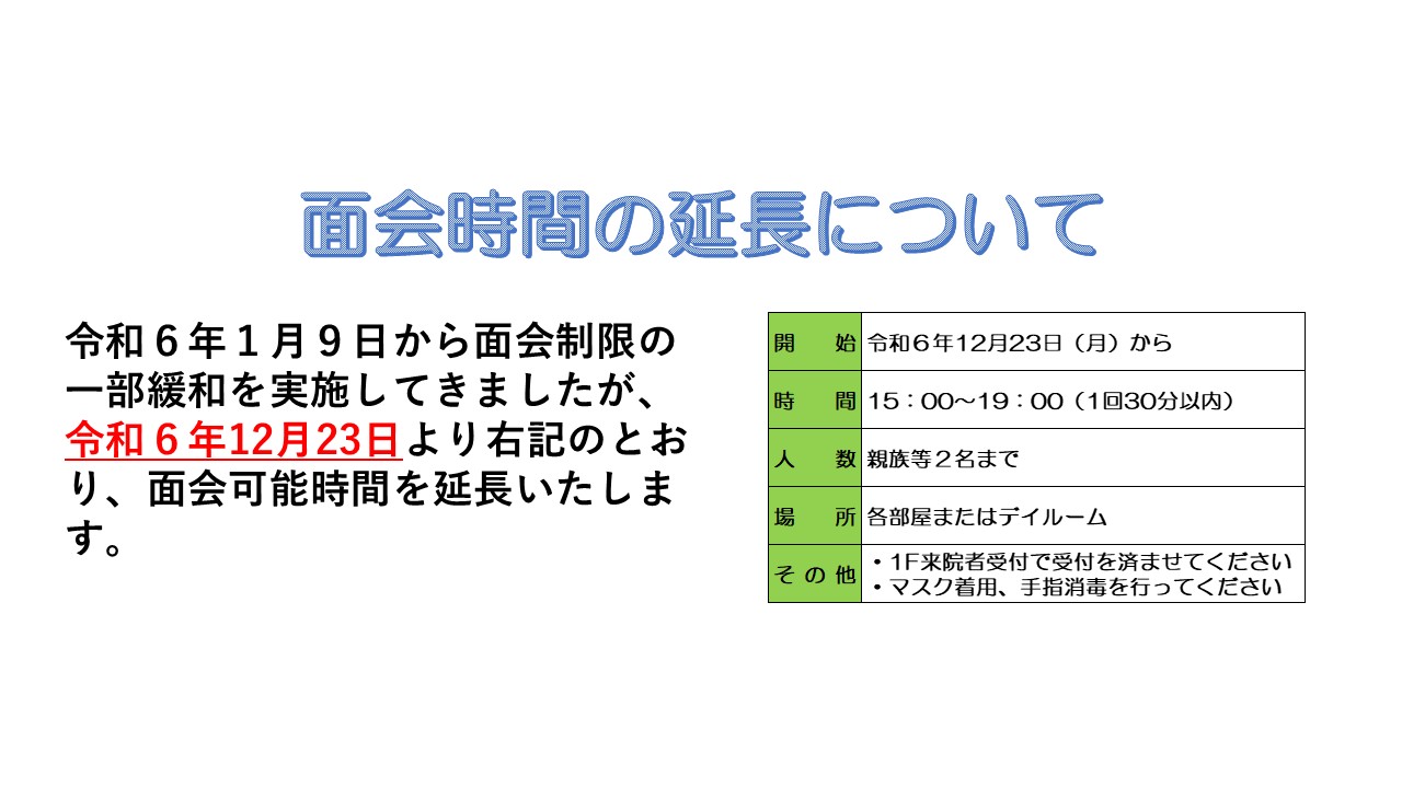 Topics 「院内フリーWi-Fi」開始のお知らせ 無料でご利用いただける院内Wi-Fiサービスを導入いたしました。詳しくはこちらをご覧下さい。 「地域連携栄養指導」のご案内 地域連携栄養指導を希望される場合は、こちらをご覧下さい。 「レスパイト入院」のご案内 レスパイト入院を希望される場合は、こちらをご覧下さい。 「夜間診療」のお知らせ 毎週木曜日に夜間診療を行っています。 詳細についてはこちらをご覧下さい。 「禁煙外来」のお知らせ 当院では禁煙治療を行っております。詳細についてはこちらをご覧下さい。 ただし、内服薬ではなく、貼り薬のみの治療になります。 当院は和歌山県立医科大学医学部の教育協力病院です。 Information 2024.01.16 病院からのお知らせ 「番号非通知」の電話の取扱いについて 2023.12.13 病院からのお知らせ 採用情報の更新(一般事務職、薬剤師) 2023.01.04 病院からのお知らせ 令和5・6年度入札参加資格審査申請受付について 2022.09.29 病院からのお知らせ 病棟再編に関するお知らせ 2022.07.01 病院からのお知らせ 採用情報ページを更新しました もっと見る